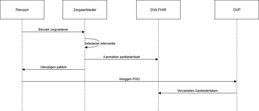 Zorgaanbieder maakt een taak. De taak mag verwijzen naar andere taken of naar resources zoals ActivityDefinition. Een zorgaanbieder communiceert dit met DVP als een FHIR R4 Task-resource. Zie Gegevensdienst Verzamelen Aanbiedertaken voor details. De taak verwijst naar Patient, ActivityDefinition en Endpoint-resources die DVA ook aanbiedt.