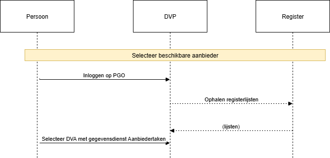 De processtappen voor het uitlezen van stelselregisterlijsten zijn bekend en geïmplementeerd bij deelnemers. Voor de volledigheid een overzicht met voorbeeld. Gebruiker van een PGO kiest een Zorgaanbieder uit de lijst met DVA die de gegevensdienst ondersteunt.