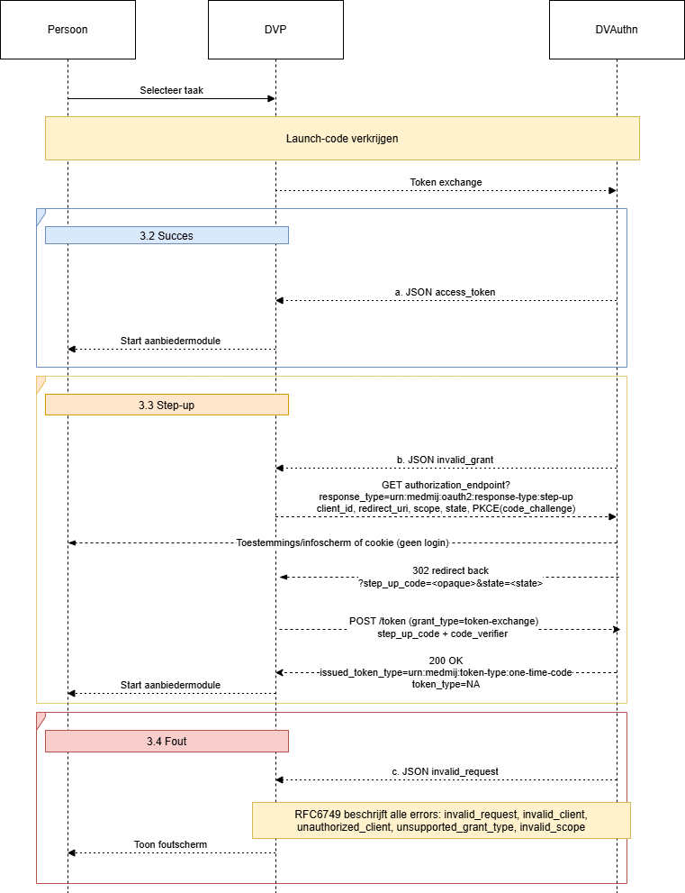 3. Step-up afhandelen | DVA kan er voor kiezen geen launch-code terug te geven, maar in plaats daarvan een stepup-error te retourneren. De foutrespons geeft dan met Zie ook: 3.4 Aanvragen launch-code | Step-up-flow: Waarom? Toekomstbestendigheid. Optionele feature voor toekomstige scenario's. Usecase: wanneer DVA extra verificatie nodig acht voor gevoelige modules of specifieke gegevenstoegang. |