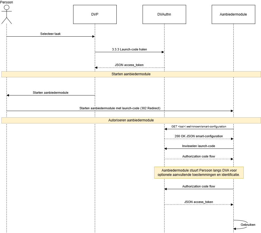 3. Uitwisselen launch-context | Aanbiedermodule ontvangt de gebruiker met een browserverzoek op de launch-url, leest de code en issuer uit, en vraagt DVA de code om te wisselen voor een |